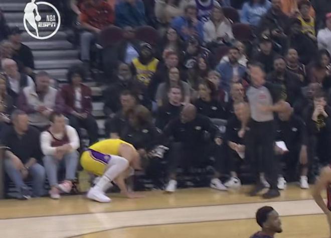 比賽第一節(jié),湖人球員東契奇投籃后撤的過(guò)程中踩到了騎士主場(chǎng)地板的邊緣,一腳踩空導(dǎo)致崴腳,之后返回了更衣室。