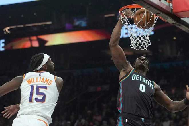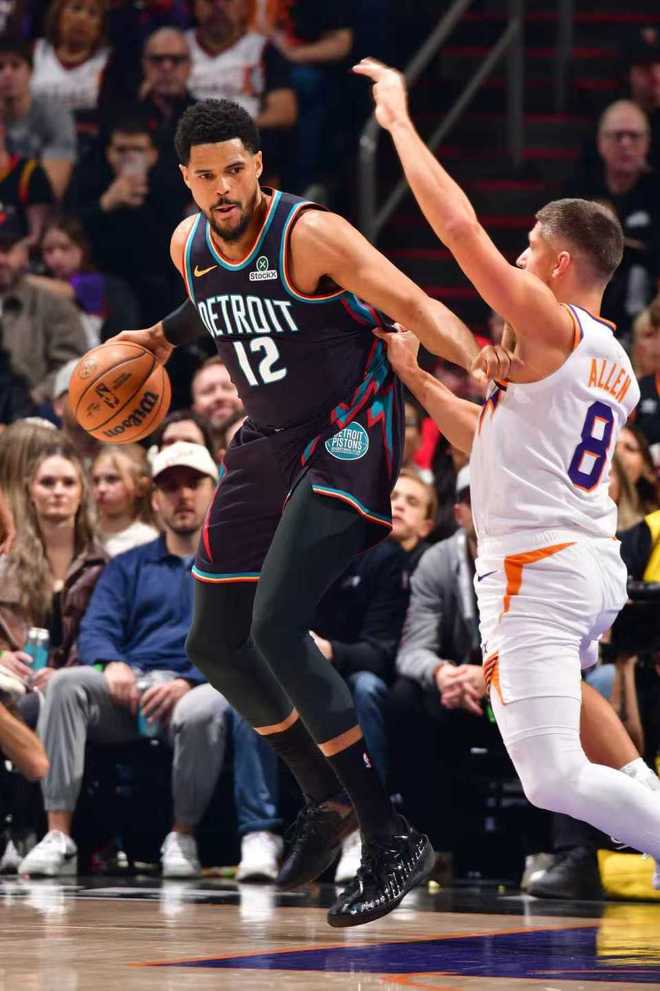 中場休息回來,雙方進攻火力下滑均是單節(jié)不超過25分,狄龍繼續(xù)給力表現(xiàn)爆發(fā),他第三節(jié)單節(jié)7中4得到14分,但其余隊友合計只得到7分??矊幇才c杜倫相繼得分20+率隊反撲追分,活塞單節(jié)25-21追回4分,三節(jié)結(jié)束太陽93-81領(lǐng)先活塞。前三節(jié)比賽,活塞三分23中6,坎寧安24分7助攻與杜倫21+10、哈里斯13分;太陽三分31中12,狄龍18中12命中4記三分狂轟38+7,阿倫19分與吉萊斯皮10分。