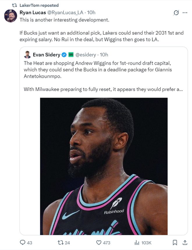 除此之外,根據(jù)《福布斯體育》記者埃文-斯迪瑞的報道,熱火隊正在兜售威金斯,他們?yōu)榱俗非髶P尼斯希望從嘴哥的交易中得到一個首輪簽為回報,湖人可以送出他們2031年無保護的首輪簽,而且在交易中無需納入八寸壘,只要湖人愿意送出首輪簽就可以得到威金斯。