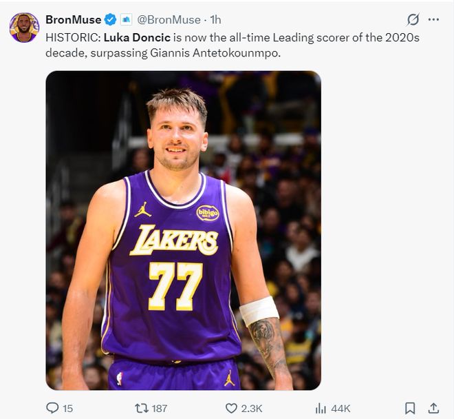 湖媒:東契奇剛剛完成了湖人隊(duì)史最快三雙紀(jì)錄,這個(gè)紀(jì)錄不是來自在湖人效力13個(gè)賽季的魔術(shù)師,也不是在湖人效力8個(gè)賽季的勒布朗,更不是在湖人效力20賽季的科比,而是僅僅代表湖人出戰(zhàn)67場(chǎng)的盧卡。
