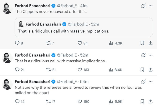 裁判在沒有哨子的情況下主動看回放給哨引發(fā)了快船記者Farbod Esnaashari的不滿,他表示:我完全不明白裁判在沒有響哨的情況下看回放是什么意思,這明顯是一個違規(guī)的行為,那是一個黃滅的決定,而且影響是極其深遠(yuǎn)的。