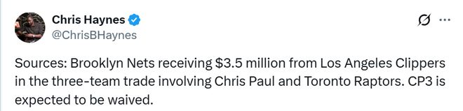 北京時(shí)間2月5日,據(jù)名記Shams報(bào)道,快船、籃網(wǎng)和猛龍達(dá)成了一筆關(guān)于保羅的三方交易。具體內(nèi)容如下——