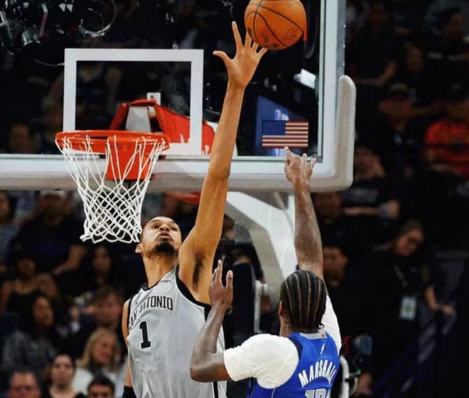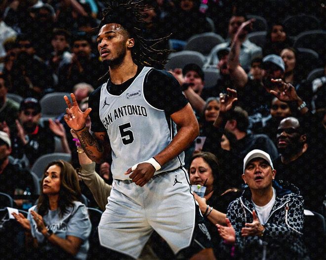 次節(jié)比賽,雙方進攻火力升級均是單節(jié)35+對攻,馬刺更是本場首次單節(jié)轟下40+得分。馬刺在前3分半鐘47-48被反超,雙方之后緊咬比分纏斗至馬刺58-56,馬刺連得5分擴大優(yōu)勢。獨行俠連追4分,卡斯爾攻傳結合率隊擴大優(yōu)勢,馬刺單節(jié)42-35凈勝7分,上半場結束馬刺擴大81-67領先獨行俠。前兩節(jié)比賽,馬刺三分命中數10-6領先,文班亞馬12分、卡斯爾8中8得到21+5+7(卡斯爾成為NBA歷史第二年輕半場轟下至少20+5+5且百分百命中率的球員,僅遜色于??怂?。),引領4人得分上雙;弗拉格11+3+3與克萊16+3三分。