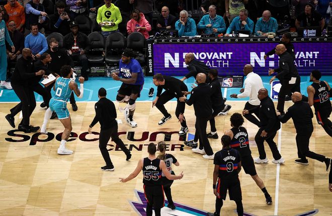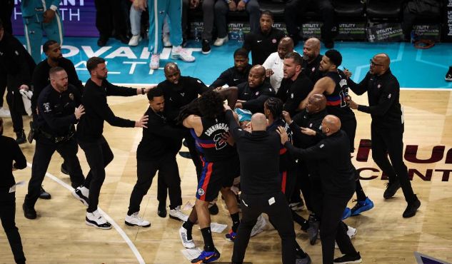 在該場(chǎng)比賽進(jìn)行到第三節(jié)時(shí),雙方爆發(fā)大規(guī)模沖突。先是杜倫與迪亞巴特兩位內(nèi)線發(fā)生肢體沖突,其中杜倫掌摑迪亞巴特的面部,他追著杜倫要打引發(fā)沖突。隨后斯圖爾特與布里奇斯加入進(jìn)來(lái),尤其是斯圖爾特隨后再次沖進(jìn)場(chǎng)內(nèi)追打布里奇斯,也是引發(fā)雙方第二輪的沖突,而迪亞巴特隨后被工作人員拉走,四位球員當(dāng)時(shí)全部被驅(qū)逐離場(chǎng)。