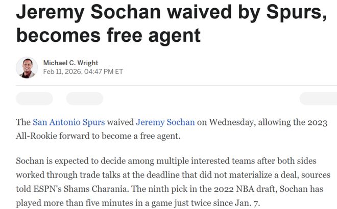 而索漢對于下家的要求也十分簡單,ESPN的Michael C. Wright曝出索漢想要加盟一支立即能獲得穩(wěn)定出場時間的球隊。