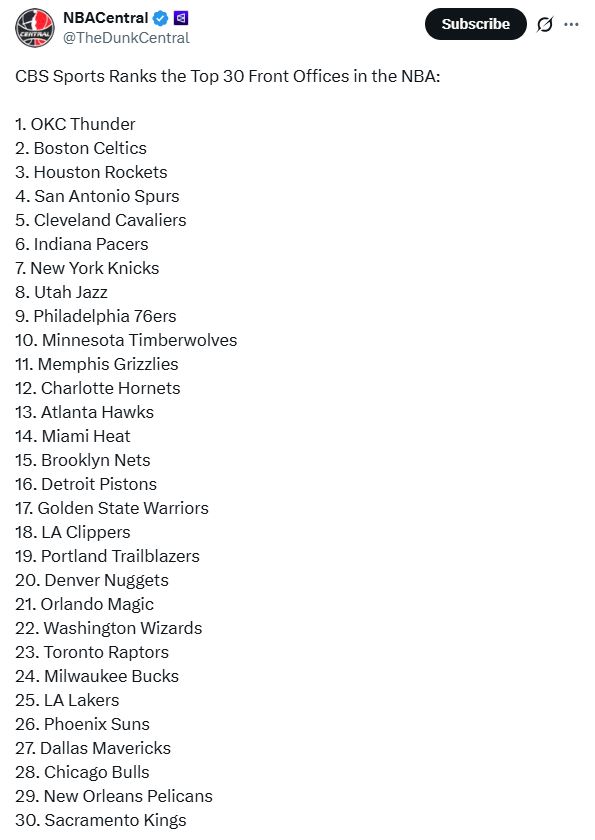 常規(guī)賽過(guò)半進(jìn)入全明星周末之際,美媒《CBS》根據(jù)本賽季前半程最新表現(xiàn)重新評(píng)價(jià)NBA各隊(duì)管理層水平排名,其中雷霆隊(duì)毫無(wú)疑問(wèn)高居第一,陷入困境的火箭隊(duì)仍高居第3,勇士隊(duì)17名,湖人僅排25位。