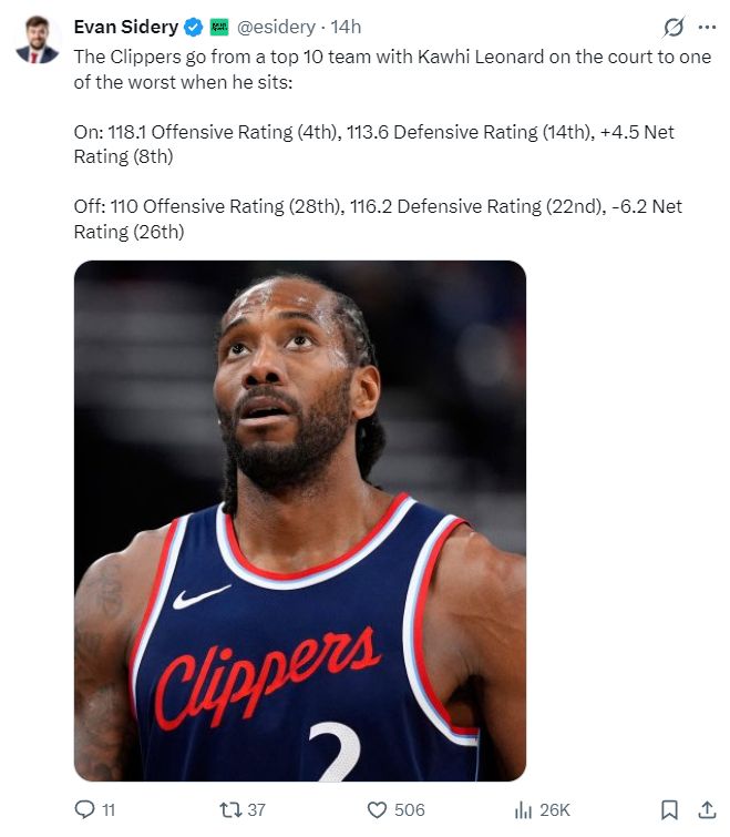 根據(jù)《福布斯體育》記者埃文-斯迪瑞最新的消息,本賽季的倫納德算是獨扛快船,卡哇伊在場時快船進攻效率118.1(聯(lián)盟第四),不在場時進攻效率110(聯(lián)盟28)。