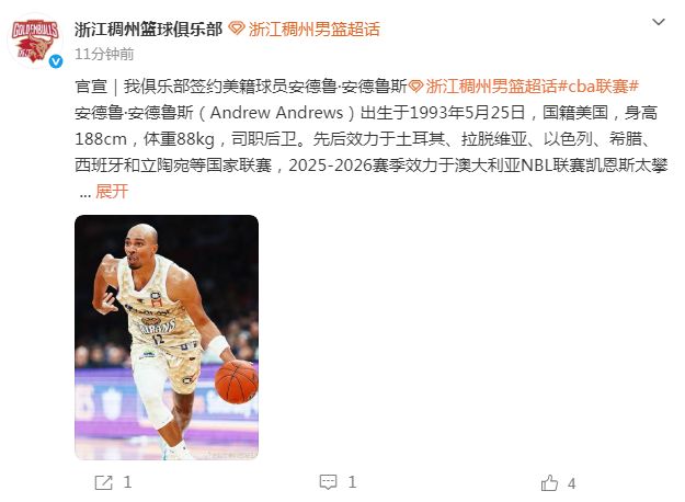 待向CBA公司完備其注冊(cè)手續(xù),安德魯-安德魯斯將正式成為俱樂(lè)部球員,代表浙江稠州金租男籃征戰(zhàn)2025-2026賽季CBA聯(lián)賽!安德魯斯將于2月24日到隊(duì),賽季身披7號(hào)球衣出戰(zhàn)。