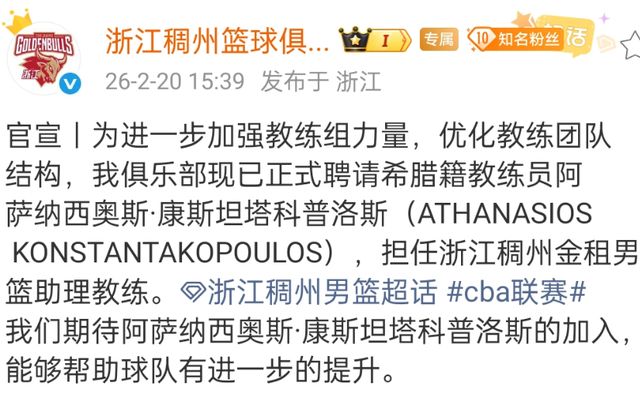 浙江男籃本賽季可以說是低開高走,賽季初期丁偉帶隊遭遇連敗,隨后就黯然下課,外教法萊卡斯接手后球隊成績提升很快,窗口期開始后,安德魯斯替代了約克,同時球隊官宣了新教練,同樣是來自希臘的康斯坦塔科普洛斯,完成了教練組的調(diào)整。