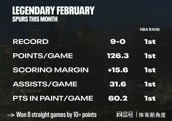 馬刺隊(duì)當(dāng)前狀態(tài)正佳,自今年二月以來(lái)保持不敗紀(jì)錄(9勝0負(fù)),且多項(xiàng)數(shù)據(jù)領(lǐng)跑聯(lián)盟:場(chǎng)均得分126.3分、場(chǎng)均凈勝分15.6分、場(chǎng)均助攻31.6次、場(chǎng)均禁區(qū)得分60.2分。這支充滿活力的青年軍已蛻變?yōu)椴豢珊鲆暤臓?zhēng)冠勁旅,他們上一次問(wèn)鼎總冠軍還要追溯至2014年的GDP時(shí)代。如今,馬刺隊(duì)的崛起已成事實(shí),其爭(zhēng)冠前景值得期待。