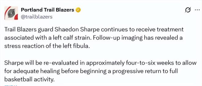 北京時間2月25日,開拓者官方更新傷病報告,后衛(wèi)謝登-夏普仍在接受左側(cè)小腿拉傷的相關(guān)治療。復(fù)查影像顯示,他出現(xiàn)了左側(cè)腓骨應(yīng)力性反應(yīng)。夏普將在約4–6周后接受重新評估,以確保傷勢充分愈合,之后再逐步恢復(fù)完整的籃球訓(xùn)練與比賽。