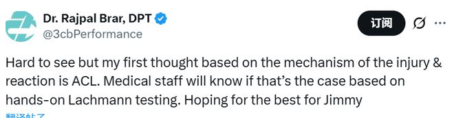 醫(yī)學(xué)專家Brar寫道:“雖然看得不太真切,但從受傷動作和他的反應(yīng)來判斷,我第一反應(yīng)是前交叉韌帶(ACL)損傷。隊醫(yī)通過徒手拉克曼試驗,就能確診傷情。真心為吉米祈禱,希望他能逢兇化吉?!?/p>
