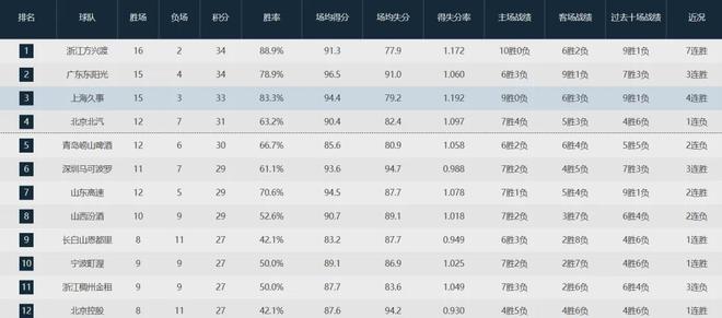 迄今為止,戰(zhàn)績排在北京隊(duì)前面的隊(duì)伍,分別是衛(wèi)冕冠軍廣廈隊(duì)(16-2)、廣東隊(duì)(15-4)和上海隊(duì)(15-3)。