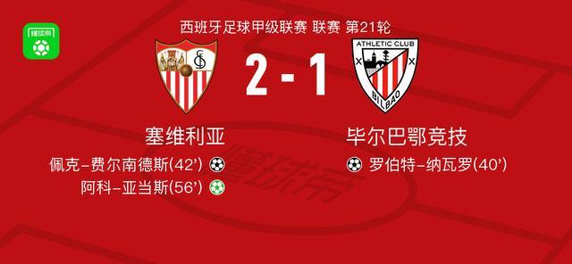 北京時(shí)間1月25日,西班牙足球甲級(jí)聯(lián)賽第21輪,塞維利亞主場(chǎng)對(duì)陣畢爾巴鄂競(jìng)技。羅伯特-納瓦羅率先破門(mén),隨后佩克-費(fèi)爾南德斯破門(mén)扳平比分,阿科-亞當(dāng)斯主罰點(diǎn)球命中完成反超。最終塞維利亞以2比1戰(zhàn)勝畢爾巴鄂競(jìng)技。