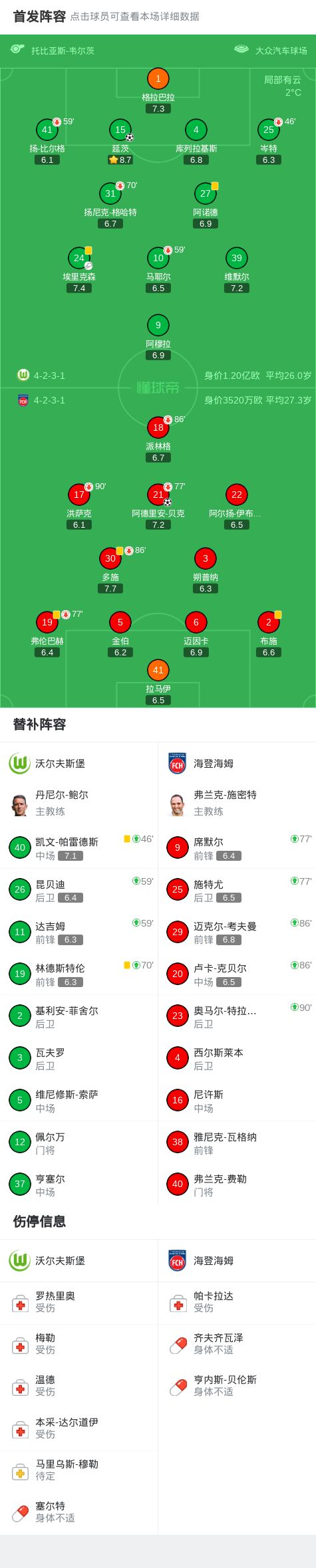 北京時(shí)間1月17日德國(guó)足球頂級(jí)聯(lián)賽 聯(lián)賽 第18輪,沃爾夫斯堡主場(chǎng)對(duì)陣海登海姆。沃爾夫斯堡延茨破門。海登海姆阿德里安-貝克破門。最終比分沃爾夫斯堡 0-1 海登海姆。