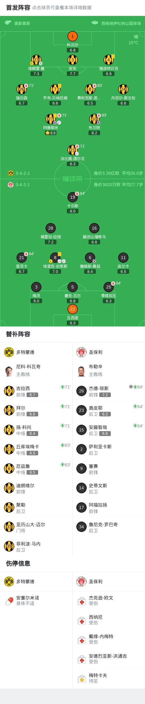 第72分鐘,史密斯開出任意球,瓊斯墊射破門,圣保利2-2多特