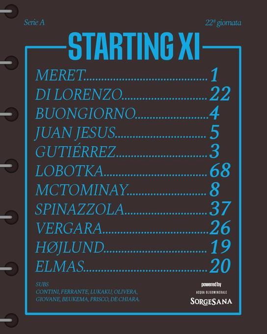 那不勒斯首發(fā):1-梅雷特、5-熱蘇斯、4-布翁焦爾諾、22-迪洛倫佐、3-古鐵雷斯、8-麥克托米奈、68-洛博特卡、37-斯皮納佐拉、20-埃爾馬斯、19-霍伊倫、26-韋爾加拉