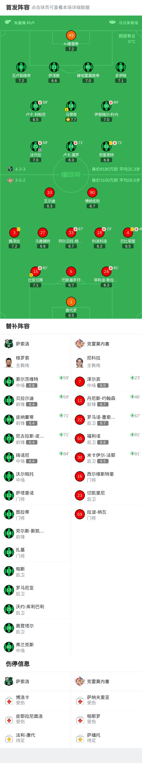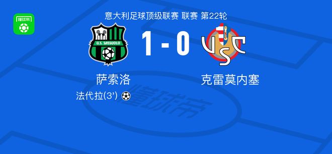 北京時(shí)間1月25日,意大利足球甲級(jí)聯(lián)賽第22輪,薩索洛主場(chǎng)迎戰(zhàn)克雷莫內(nèi)塞。比賽開(kāi)始后,薩索洛由法代拉破門(mén)得分。最終,薩索洛以1比0戰(zhàn)勝克雷莫內(nèi)塞。