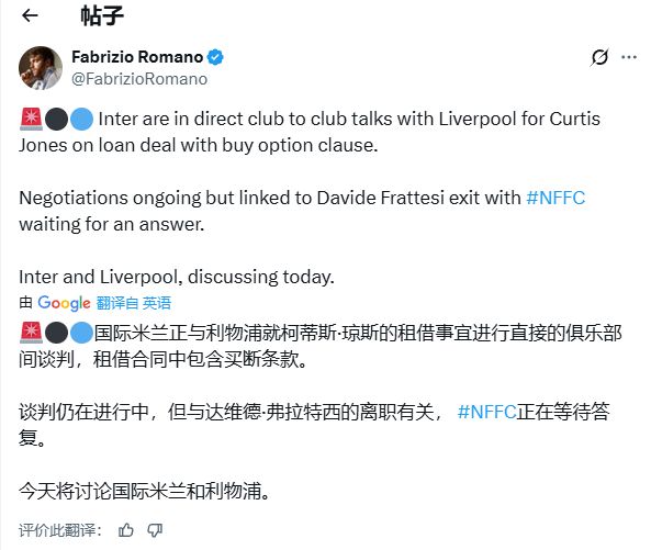 羅馬諾在X(推特)上表示:“國際米蘭正與利物浦就柯蒂斯·瓊斯的租借交易進行了俱樂部層面談判,該交易包含購買選擇權(quán)條款。談判正在進行中,但與弗拉泰西的離隊相關,諾丁漢森林正在等待答復?!?/p>