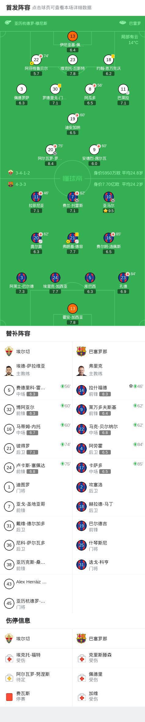 北京時間2月1日4:00,西甲第22輪繼續(xù)進行,巴塞羅那作客巴萊羅球場挑戰(zhàn)埃爾切,本場主裁判為亞歷杭德羅-穆尼斯。上半場,奧爾莫助攻亞馬爾閃擊,阿爾瓦羅-羅德里格斯扳平比分,隨后德容助攻費蘭-托雷斯破門。下半場,拉什福德替補建功。巴薩本場七次錯失絕佳機會。最終,巴薩3-1客勝埃爾切。