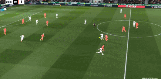 第24分鐘,巴薩后防被打穿,阿爾瓦羅-羅德里格斯打門偏出