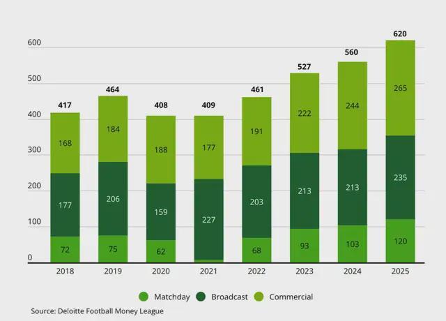 數(shù)據(jù)顯示,財富榜上的俱樂部收入累計營收增長11%,達(dá)到124億歐元(約合1027億元人民幣)。從細(xì)分類別來看,比賽日收入(24億歐元)、轉(zhuǎn)播收入(47億歐元)和商業(yè)收入(53億歐元)均創(chuàng)歷史新高,其中商業(yè)收入首次突破50億歐元大關(guān)。