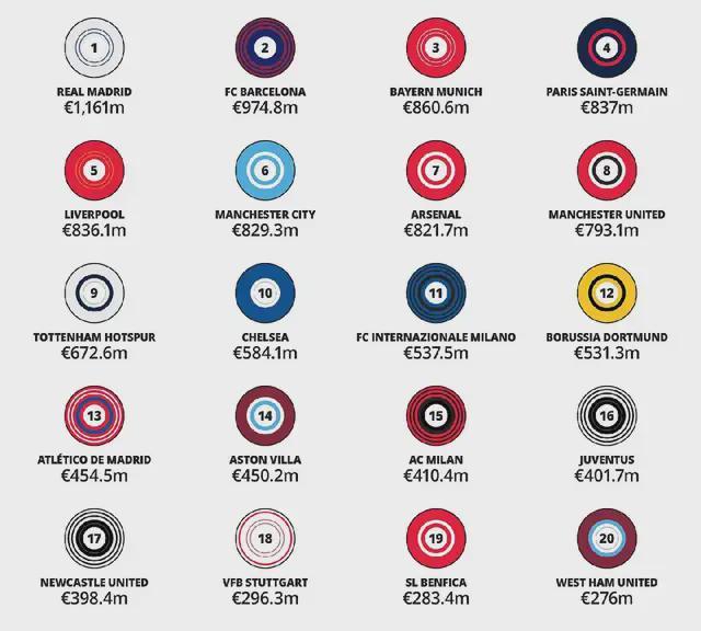 作為全球最受歡迎的的足球聯(lián)賽之一,英超俱樂部上榜前10的數(shù)量也在一定程度上展現(xiàn)了聯(lián)賽的“含金量”。