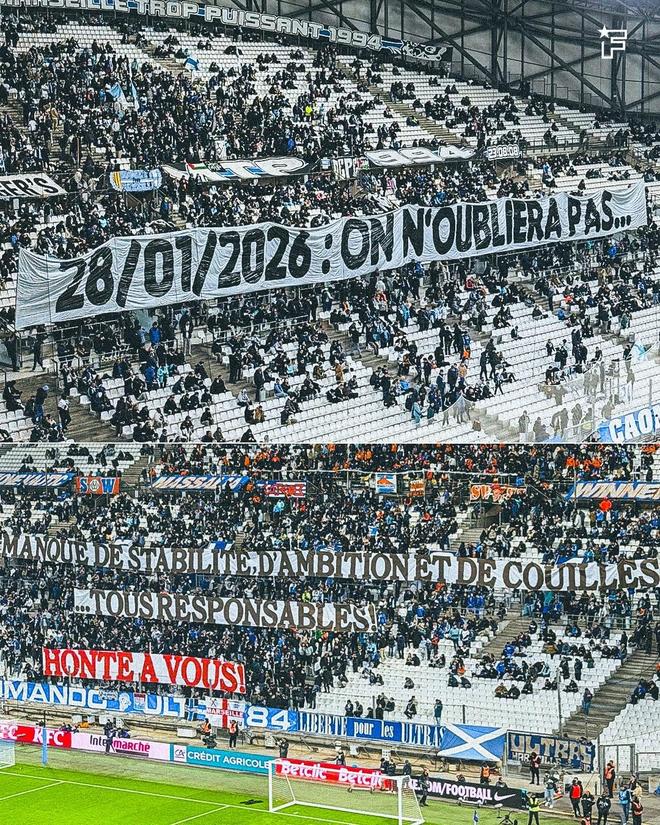 正是這場被認為“已到手卻又飛走”的出局,點燃了球迷的怒火。昨日比賽中,馬賽球迷的情緒持續(xù)發(fā)酵,看臺上懸掛起措辭極其尖銳的橫幅,橫幅上寫著“缺乏穩(wěn)定性、野心和膽量…… 所有人都有責(zé)任”,直指俱樂部缺乏穩(wěn)定性、缺乏雄心、也缺乏擔(dān)當,并將責(zé)任歸咎于管理層與球隊整體。