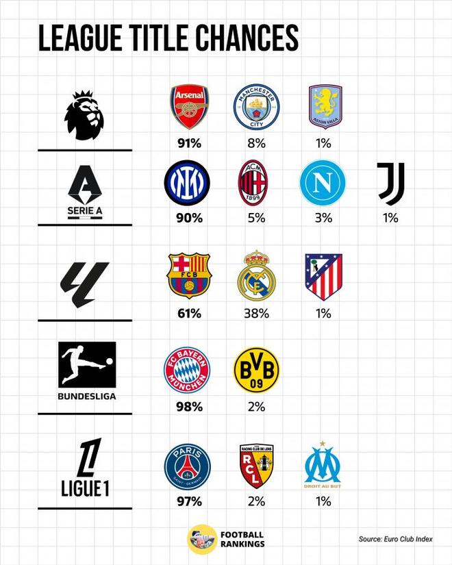 雖然本賽季還有十幾輪才會結(jié)束,不過,在五大聯(lián)賽的對比各領(lǐng)跑者的姿態(tài)是越發(fā)的明確了。就此,數(shù)據(jù)機構(gòu)EuroClubIndex也是給出了預(yù)測,就五大聯(lián)賽奪取獎杯的幾率給出計算。