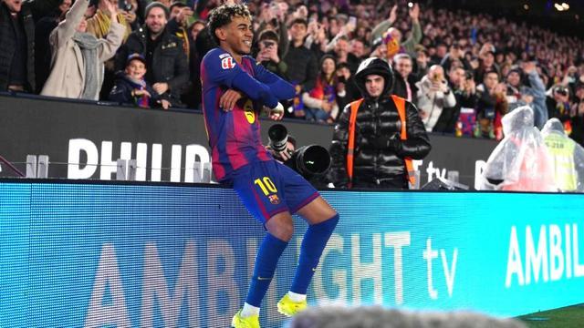 比賽第39分鐘,德容送出斜塞,右側(cè)的亞馬爾勁射破門,為球隊(duì)先拔頭籌!