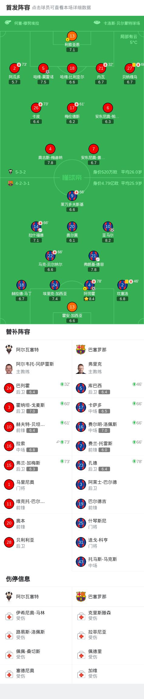 第30分鐘,內(nèi)瓦被亞馬爾壓到后傷退,巴列霍替補(bǔ)登場