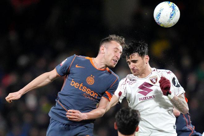 第57分鐘,國米防線出現(xiàn)一次溝通失誤。德弗賴上搶被擺脫,都靈迅速轉(zhuǎn)移到右路傳中,臨時(shí)回撤到中衛(wèi)位置的弗拉泰西被庫倫諾維奇搶點(diǎn)頭球破門,比分變?yōu)?-1。