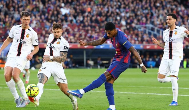 第29分鐘,巴薩進(jìn)球了!萊萬多夫斯基在禁區(qū)內(nèi)得球,他稍作調(diào)整,騙過身前的防守球員,隨即低射破門!萊萬多夫斯基太冷靜了!第37分鐘,拉什福德在禁區(qū)前沿內(nèi)切遠(yuǎn)射,被對(duì)手頭球解圍出去。半場(chǎng)補(bǔ)時(shí)階段,拉什福德任意球直接射門,被撲了出去。之后孔德把球傳到門前,結(jié)果亞馬爾面對(duì)空門機(jī)會(huì)竟然踢偏了。半場(chǎng)結(jié)束,巴薩1-0領(lǐng)先馬略卡。