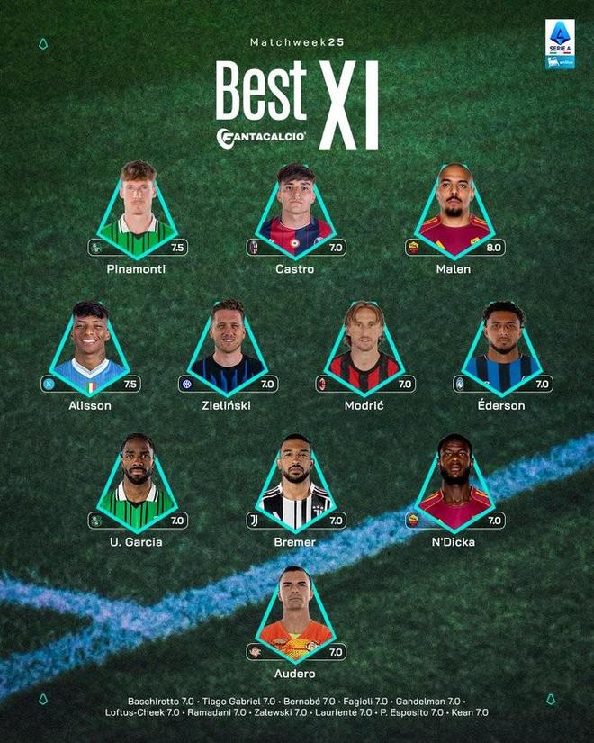 意甲官方公布了聯(lián)賽第25輪的最佳陣容,莫德里奇、澤林斯基、布雷默、馬倫在列。