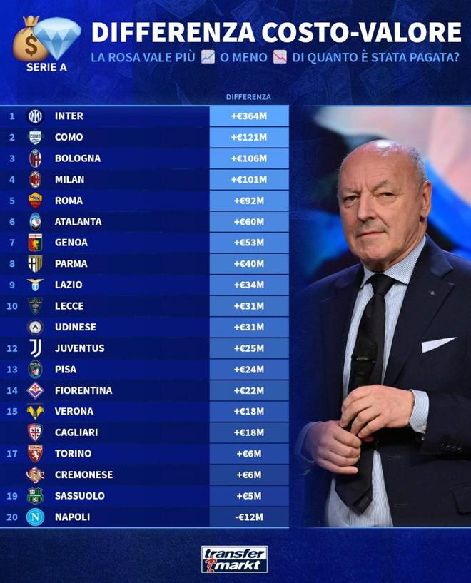 意甲20隊(duì)陣容成本和現(xiàn)有價(jià)值差異榜: