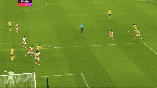 第93分鐘,馬特烏斯-馬內(nèi)左路45度傳中,拉亞果斷出擊卻判斷失誤,與后衛(wèi)配合出現(xiàn)混亂。布埃諾在禁區(qū)內(nèi)起腳,皮球擊中卡拉菲奧里后折射入網(wǎng),2-2,狼隊(duì)上演驚天絕平。