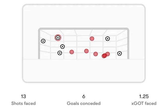 這并非偶然。本賽季英超,阿森納門將總共面對13次禁區(qū)外的射門,其中6次轉(zhuǎn)化成了進球。按照Opta的預(yù)期進球模型,根據(jù)射門角度、速度和門將位置,拉亞本應(yīng)只丟1到2球,但他實際丟了6個。