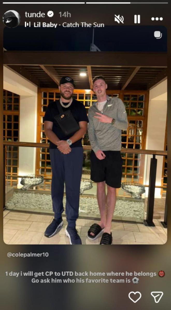 本周切爾西球員獲得賽季沖刺階段前的假期,曼徹斯特說唱歌手通德在迪拜與帕爾默相聚。