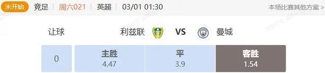 目前競(jìng)彩數(shù)據(jù)來(lái)看,給出對(duì)曼城在客場(chǎng)的支持還是合理的,利茲聯(lián)近期表現(xiàn)穩(wěn)定,曼城恐怕小勝可能性更大。