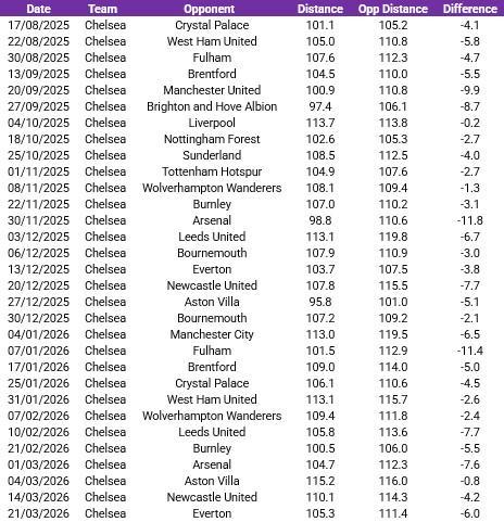 切爾西本賽季已經(jīng)完成31場英超比賽,場均跑動距離為106.1公里,為英超倒數(shù)第一,距離排行榜榜首的曼城差距為9.6公里,幾乎相當(dāng)于一名球員的全場跑動距離。