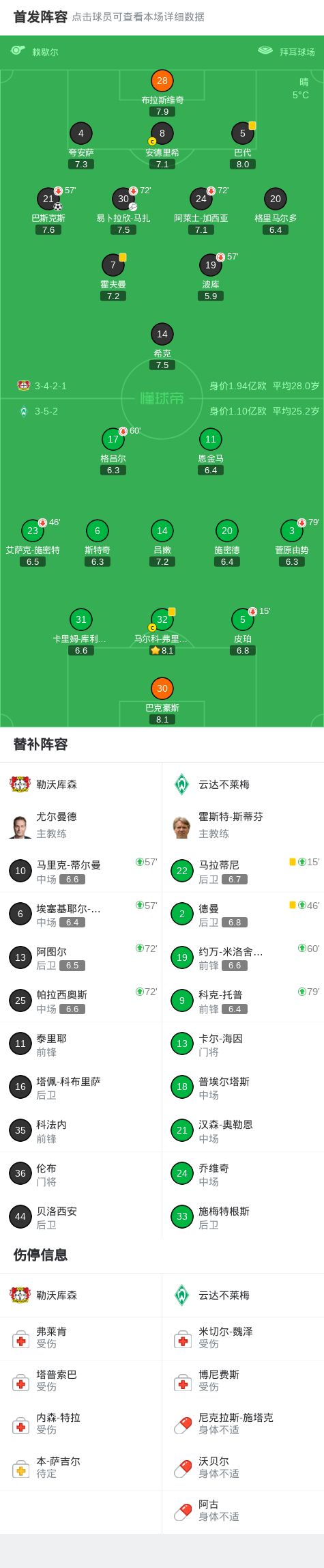 第37分鐘,先拔頭籌,巴斯克斯禁區(qū)推射遠角破門,勒沃庫森1-0
