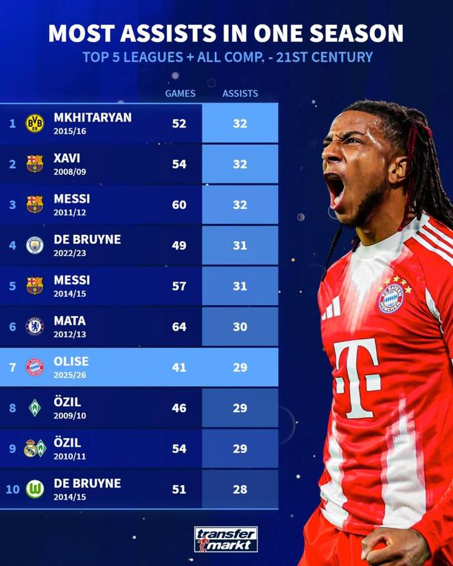 7. 奧利塞(拜仁慕尼黑)2025-26賽季 41場 29次助攻